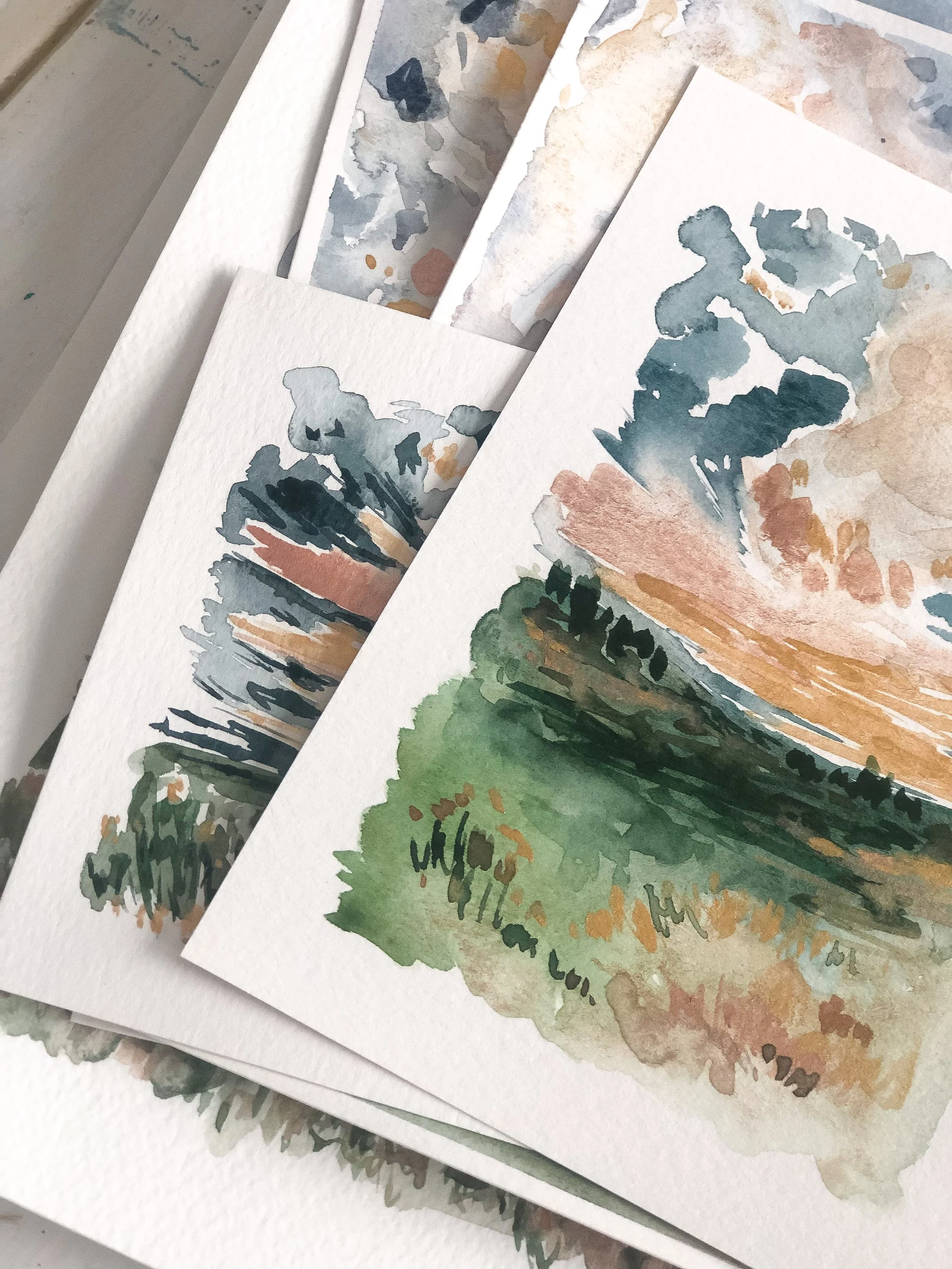 Today is the day, the Heavenly Sunsets II Collection is available! This collection is inspired by all the moments and reflections from the previous year. Having left the corporate design world to stay home with our boys, I struggled deeply with the loss of self. I felt like I was drowning in household chores and motherhood. Some days I rocked the stay at home mom life and other days was a complete mess. Painting became an escape and my primary form of self care.
